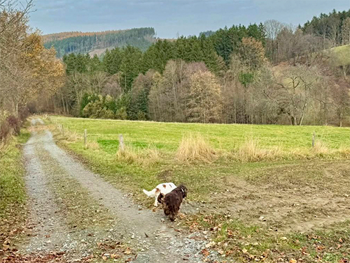 Der Versammlungsort (Pension Waldhof) liegt am Fuße des Venusberg, so dass Maite und Duke die schöne Landschaft auf dem Weg zum Venusberg (Erzgebirge) genießen und sich austoben konnten. Maite versucht dann immer Duke an der Leine zu führen, aber auch das Schnüffeln in einem fremden Wald, Feld und auf der Wiese kam nicht zu kurz. Ein schöner, gelungener Tag mit all den anderen Spaniels ging dann viel zu schnell zu Ende.